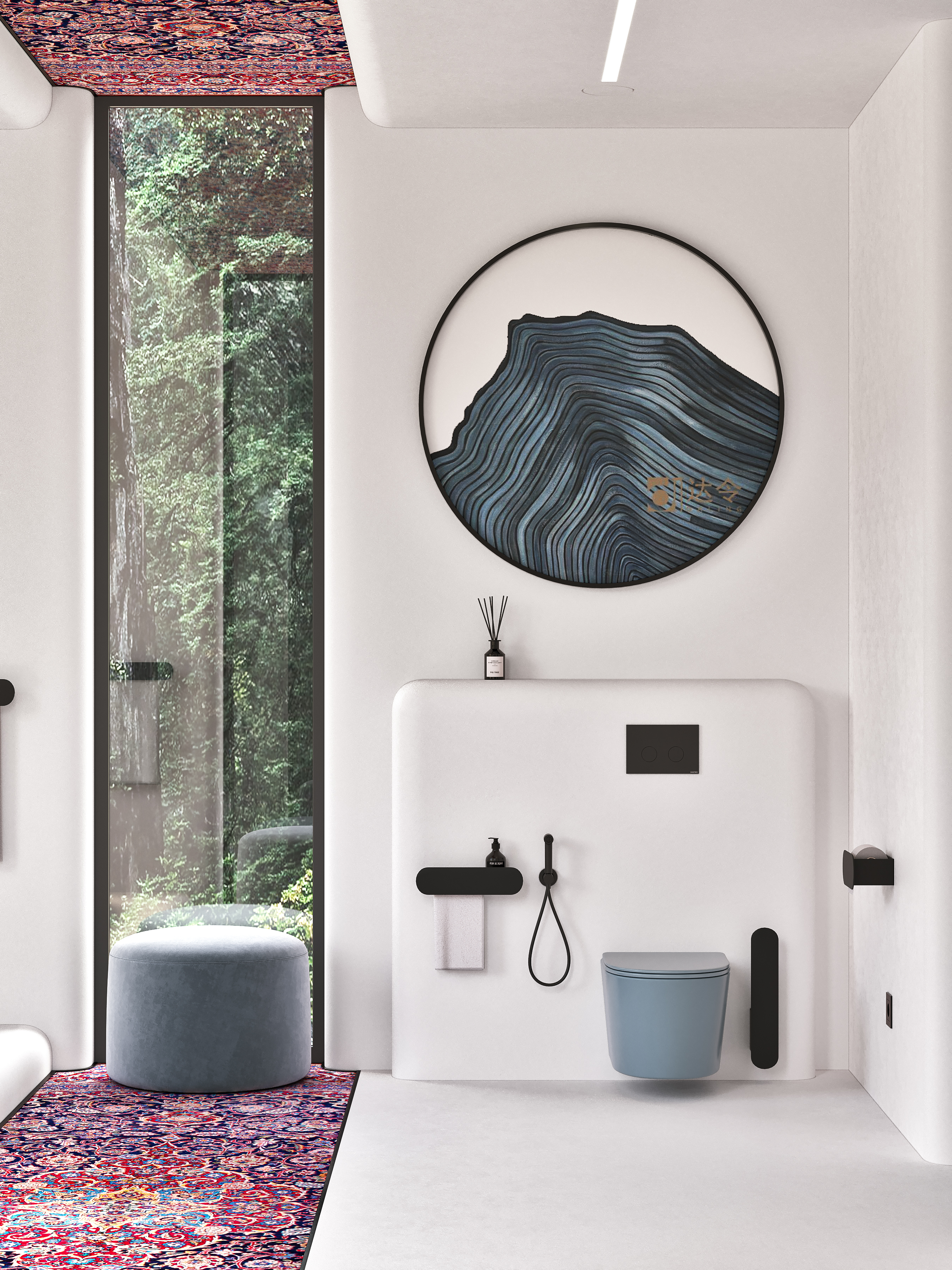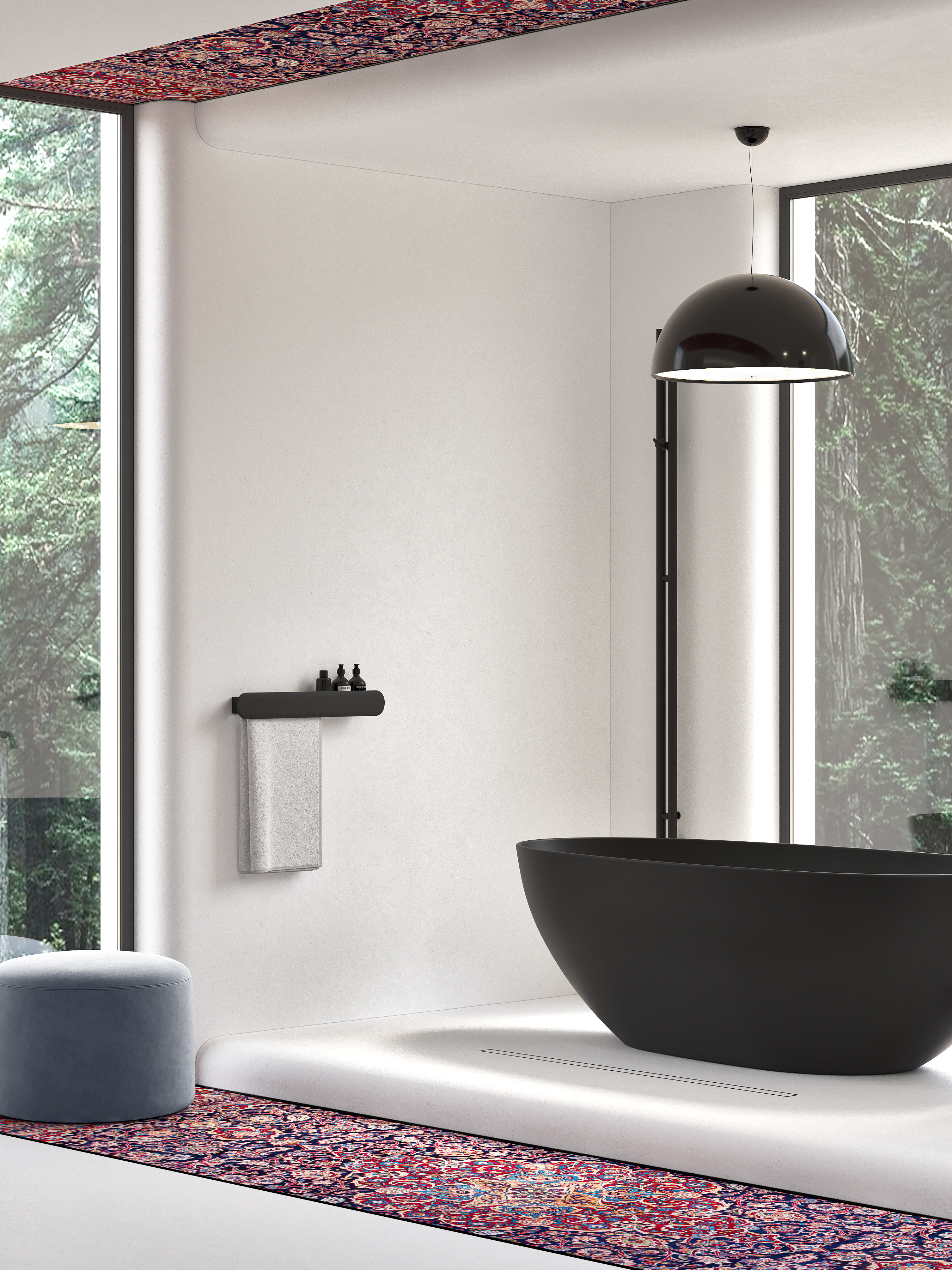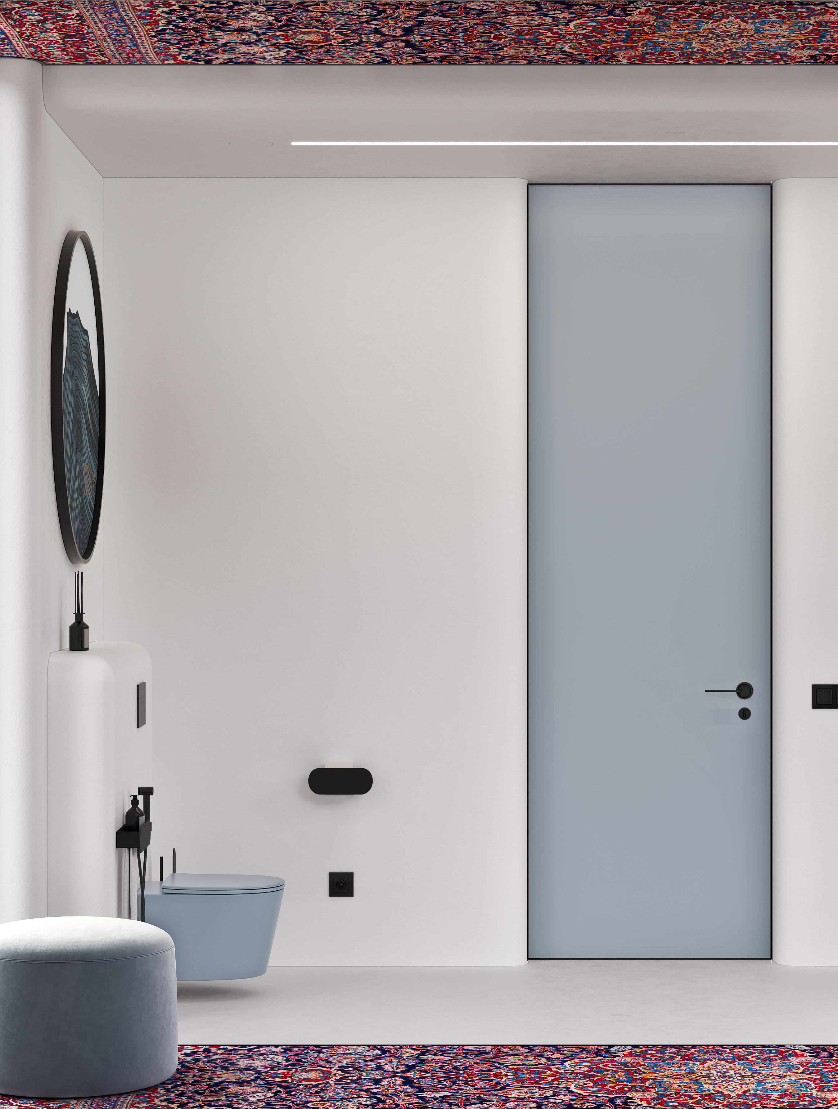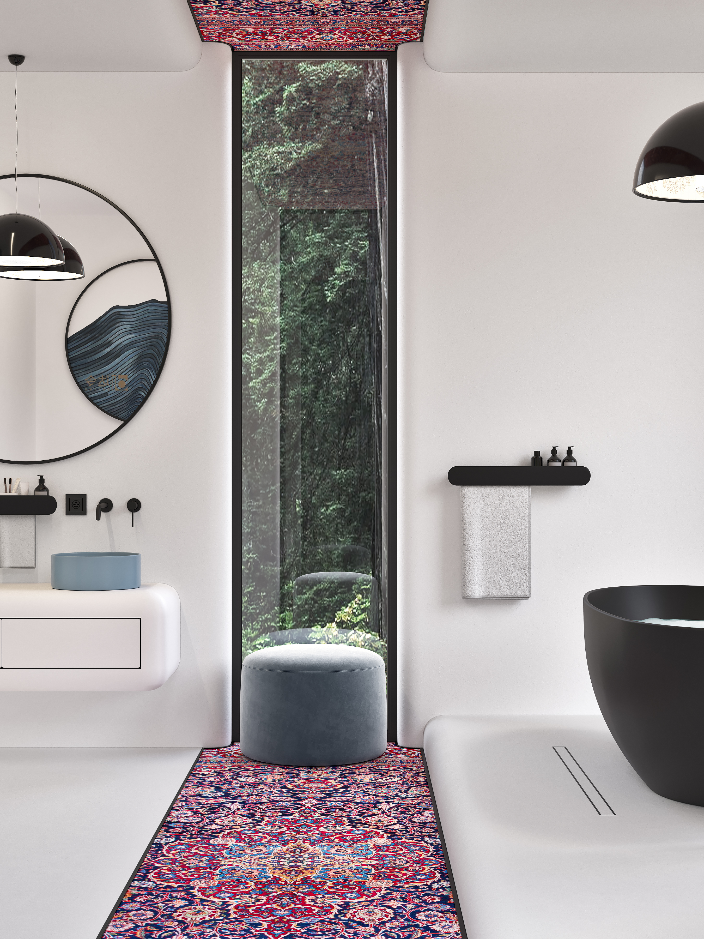 Радиальная форма внешних углов, белый и чёрный цвет в сочетании с яркими, акцентными элементами задают пространству особую атмосферу. В такой ванной можно легко отключиться от внешнего мира и погрузиться в особую атмосферу.
