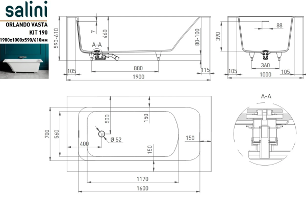 Ванна из искусственного камня Salini Orlando Vasta Kit S-Sense 190х100 белая матовая, с ножками и донным клапаном
